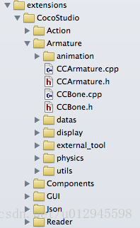 下面我们新建一个项目,将三个文件放在项目的资源文件夹中,想要创建骨骼动画,我们需要使用CCArmature类,armature译为骨骼,我们就称它为骨骼类。骨骼类位于extensions库中,我们来看一下extensions库的文件目录结构: