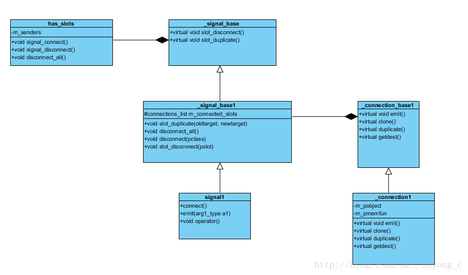| 被绑定函数所在的类行为 | 如果被绑定体的对象先于signal析构,易导致崩溃。 | 需要将has_slot<>作为基类,因为has_slot<>类维护着signal/slot关系,所以当被绑定体对象析构时候会解除关系,避免了崩溃。 如果复制类对象,类对象的副本也继续响应已经绑定的信号。因为has_slot<>的拷贝构造函数将signal/slot关系也复制了一份。 |
