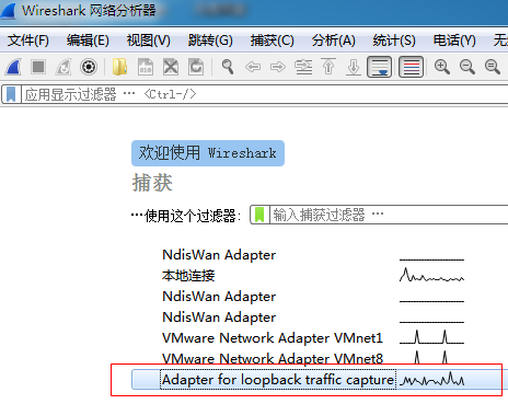 安装好了以后,打开Wireshark,选择Adapter for Loopback traffic capture,就可以捕捉本地回环数据