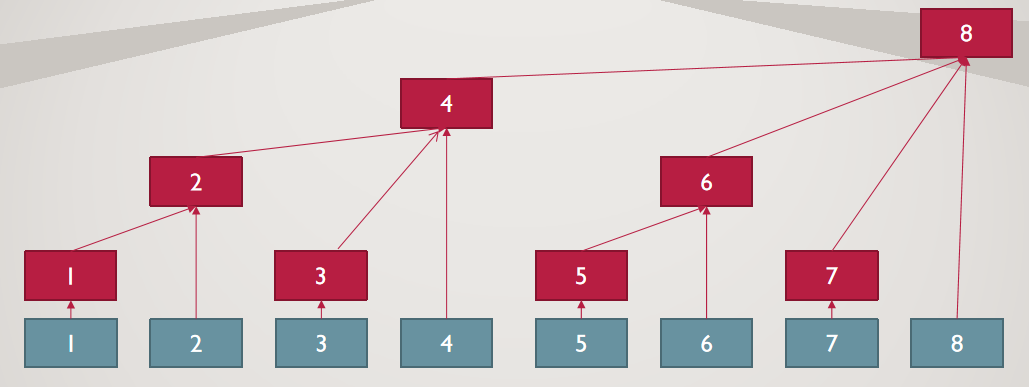 左端点的确定过程需要用二进制来解释:假设该位置为第n位,m是n对应的二进制,那么该点存放的区间的左端点对应的二进制是把m中位数最小的一个1变为0,然后加1;比如如果n = 6,那么就化为 n=m = 110,将m的最靠右的1变为0,得到 m1=100,则左端点为m1+1=101=5。