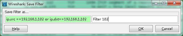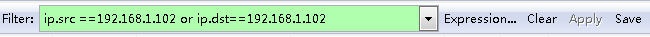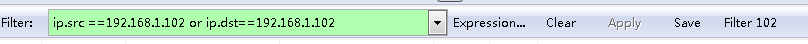 | ip.src ==192.168.1.102 or ip.dst==192.168.1.102 | 源地址或者目标地址是192.168.1.102 |