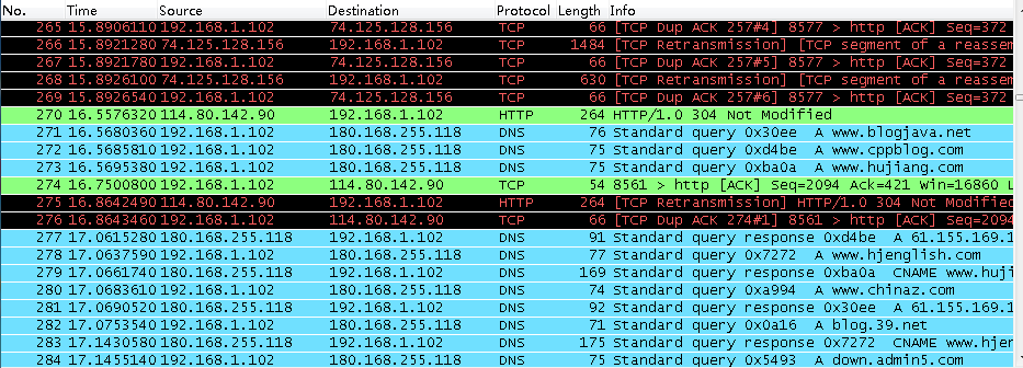 封包列表的面板中显示,编号,时间戳,源地址,目标地址,协议,长度,以及封包信息。 你可以看到不同的协议用了不同的颜色显示。