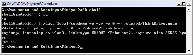 adb shell #登入手机su #切换Root用户/data/local/tcpdump -p -vv -s 0 -w /sdcard/ThinkDrive.pcap #执行抓包命令,结果保存到SD卡ThinkDrive.pcap文件中
