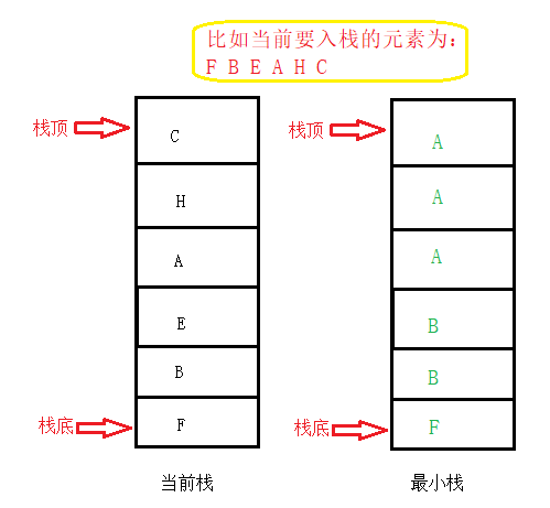 方法2:使用1个栈来实现,每次入栈两个元素,第一个元素是需要入栈的元素,另一个元素是与栈顶比较时较小的值,如果栈顶元素较小,那么第二个元素就是栈顶元素。否则第二个元素就是当前要入栈的元素。如下图所示: