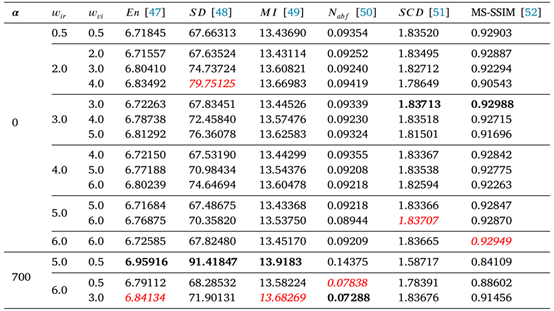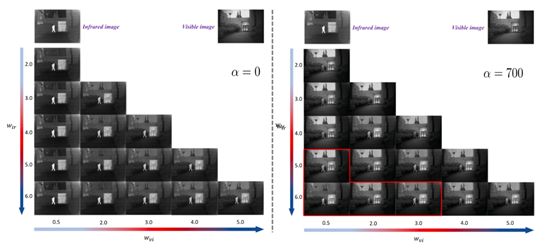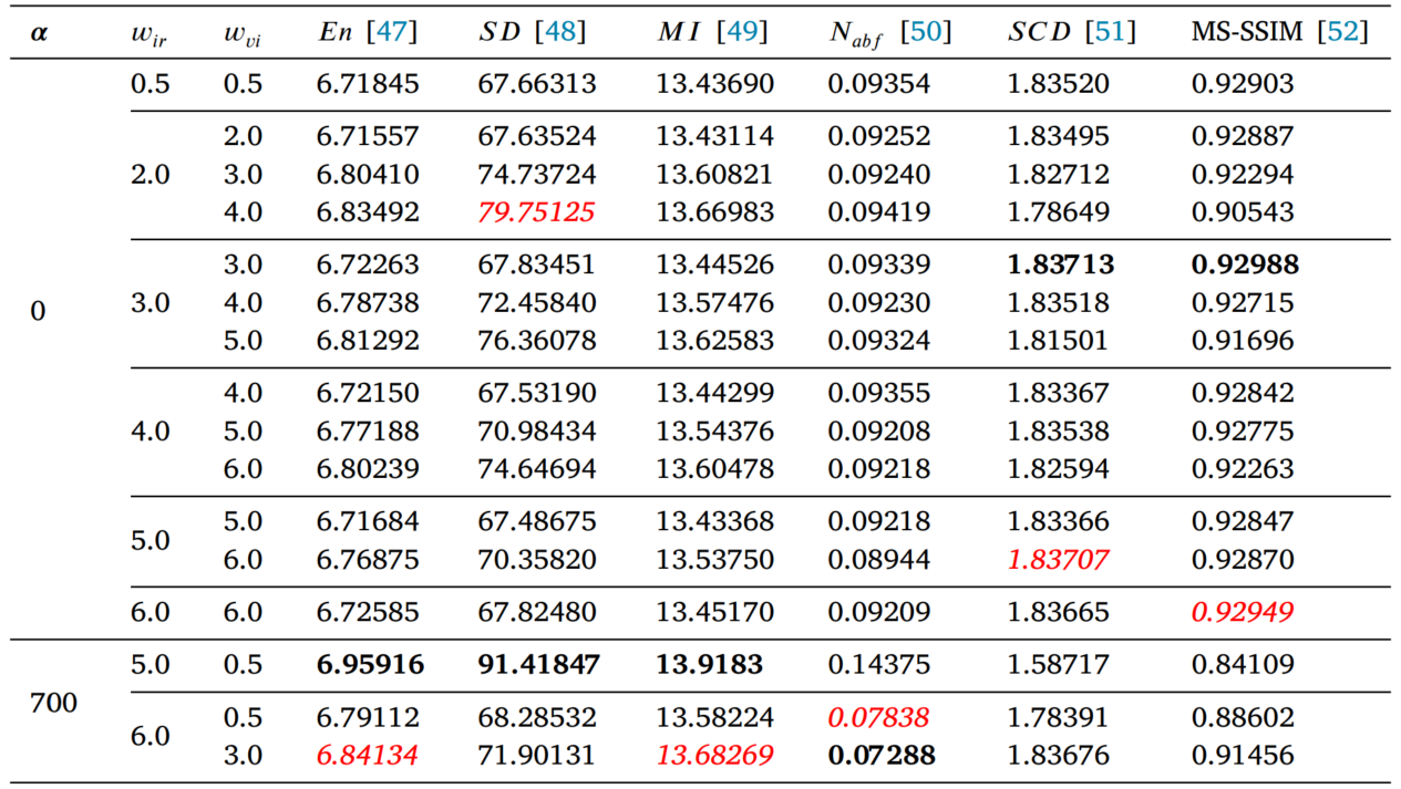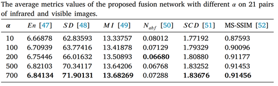 的取值设置为{1, 10, 100, 1000} ,最优α值的搜索范围设置为{10, 100, 200, 500, 700, 1000} ,结果如下图和下表,可以看出α设置为最大的1000时红外图像的显著性信息基本看不见了,只有500和700时才能较好同时保留细节信息和显著性信息。最终的指标显示α=700时最优,因此后续实验将α固定为700。