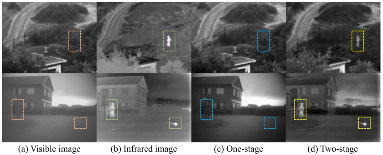 可以看出可见光细节在一阶段训练法中被大大增强,红外显著性信息基本丢失,相反右边的两阶段训练就对这两种信息都保留的很好。作者认为这样的原因是编码器-解码器的特征提取和重建能力不足,顺便对他提出的RFN称赞不绝。