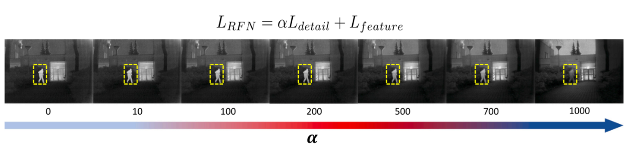 1.主要针对背景细节保护损失函数和目标特征增强损失函数,也有可见光和红外特征的相对权重对融合性能的影响。因为节保护损失和特征增强损失差异巨大,所以α也需要设置的较大才可,同时也因为细节保护损失保护可见光的细节,最终α的范围设置为0和700进行分析。目标特征增强损失函数中研究