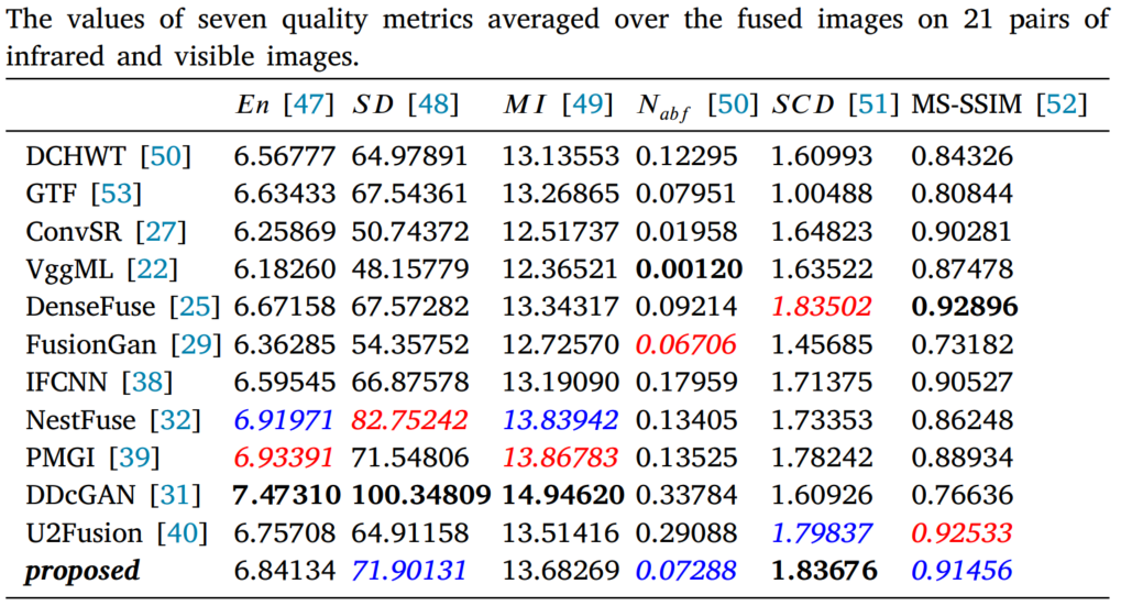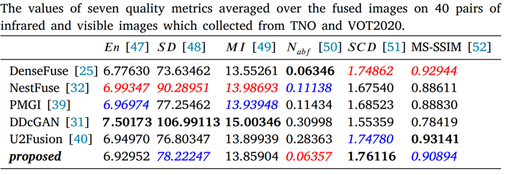 测试数据来自于TNO和VOT2020-RGBT,TNO有21张图片对,VOT2020有40个图片对。用6种指标进行评估,即entropy(????????); standard deviation (????????);mutual information(????????); modified fusion artifacts measure (???????????????? ); the sum of the correlations of differences(????????????); the multi-scale structural similarity (MS-SSIM)。