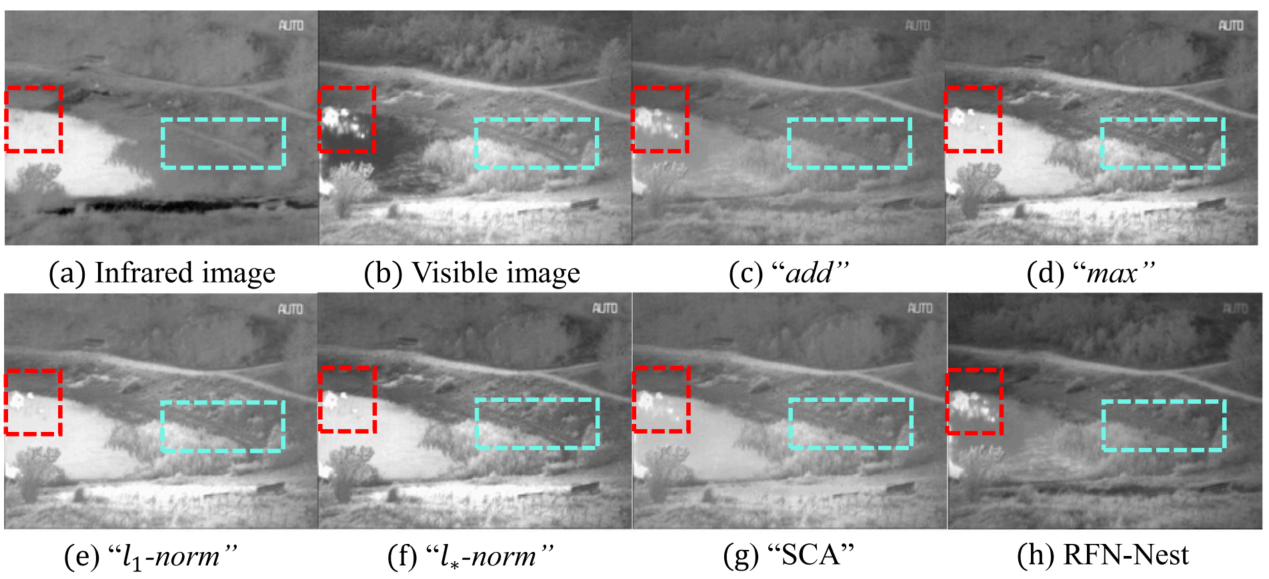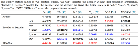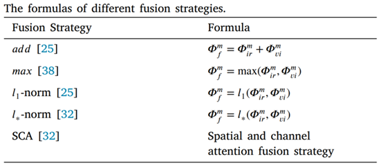 5.融合策略:本部分探究提出的RFN在融合策略方面的优势,选择了 ????????????、????????????、????1-norm、????∗-norm、SCA这几种先前的融合方法作为对比,这四种方式的计算方法如下。SCA是NestFuse模型中曾经用过的方法。