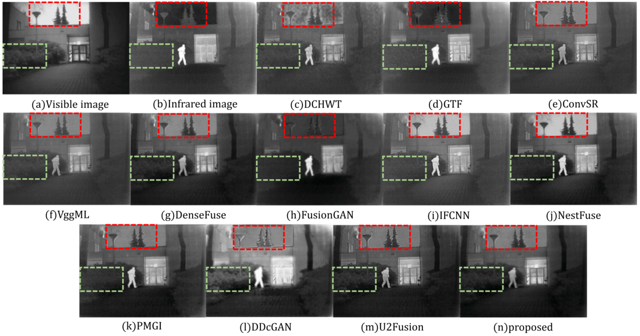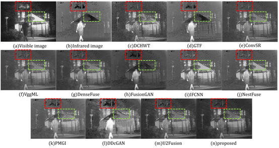 上图结果可以看出,DCHWT包含噪声较多。GTF和FusionGAN的融合结果更平滑,细节信息更多,但是直观看更像红外图,尤其是背景部分。ConvSR、VggML、DenseFuse、IFCNN、NestFuse、PMGI、U2Fusion都保留了更多的可见光信息,对红外显著性信息削弱的较多。DDcGAN的结果噪声较多,并且红外目标被模糊。