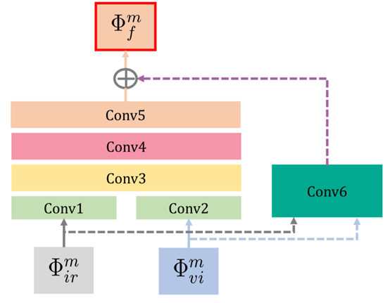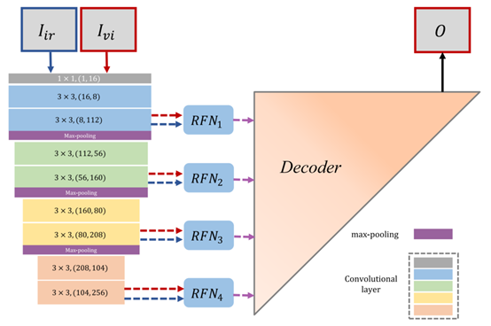 编码器有最大池化层将原始图像下采样为多尺度,RFN将每个尺度的多模态深度特征进行融合。浅层特征保护细节信息,深层特征传递语义信息(对重建显著性特征很重要)。最后融合图像通过基于nest connection的解码层网络进行重建。网络的输入层分别为红外图像和可见光图像,输出即为融合图像,4个RFN是四个尺度上的融合网络,4个网络模型结构相同,权重不同。