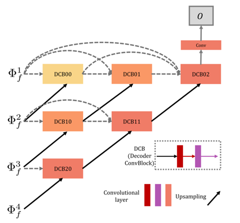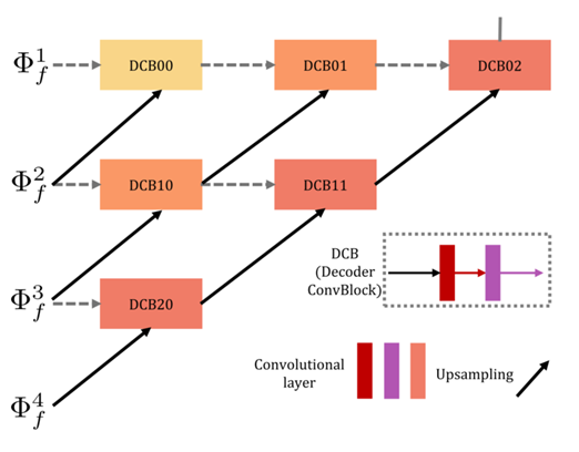 解码器的结构如下图,以nest connection为基础而来的。