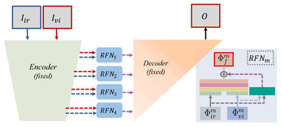 第二步是训练RFN,用于学习融合策略。这一步将编码器-解码器结构固定,再用适当的损失函数来训练RFN,过程如下。