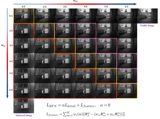 分别控制融合特征中可见光和红外图像的占比。因为可见光信息被背景细节保护损失函数约束,同时目标特征增强损失函数保护了红外图像的显著性信息,所以![]()