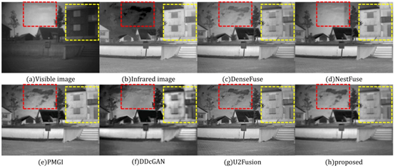 上面实验显示很多方法都不能有效处理天空中的云这种纹理信息,融合结果不自然。注意和之前的方法一样DDcGAN还是引入和过多噪声并且模糊了红外目标。