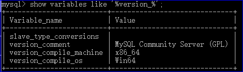 查看mysql版本信息,进入mysql,输入命令:show variables like '%version_%';