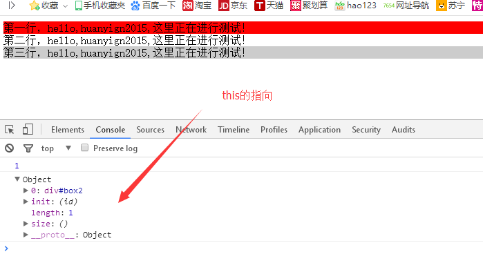 1 <!DOCTYPE html> 2 <html lang="en"> 3 <head> 4 <meta charset="UTF-8"> 5 <meta name="viewport" content="width=device-width, initial-scale=1.0"> 6 <meta http-equiv="X-UA-Compatible" content="ie=edge"> 7 <title>Document</title> 8 </head> 9 <body> 10 <script> 11 // 设置一个构造函数G,当调用它时,返回挂载在它身上的fn对象上的 init() 函数 12 var G = function(id) { 13 return G.fn.init(id); 14 }; 15 // 把G上的fn 对象指向G的原型对象,即指向 G.prototype 16 G.fn = G.prototype = { 17 init: function(id) { 18 this[0] = document.getElementById(id); 19 this.length = 1; 20 return this; 21 }, 22 length: 0, 23 size: function() { 24 return this.length; 25 } 26 }; 27 window.onload = function() { 28 G("box")[0].style.background = 'red'; 29 G("box2")[0].style.background = '#ccc'; 30 console.log(G("box").size()); 31 console.log(G("box2")); 32 } 33 </script> 34 <div id="box">第一行,hello,huanyign2015,这里正在进行测试!</div> 35 <div id="box1">第二行,hello,huanyign2015,这里正在进行测试!</div> 36 <div id="box2">第三行,hello,huanyign2015,这里正在进行测试!</div> 37 </body> 38 </html>