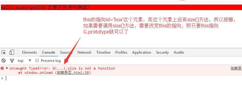 1 <!DOCTYPE html> 2 <html lang="en"> 3 <head> 4 <meta charset="UTF-8"> 5 <meta name="viewport" content="width=device-width, initial-scale=1.0"> 6 <meta http-equiv="X-UA-Compatible" content="ie=edge"> 7 <title>Document</title> 8 </head> 9 <body> 10 <script> 11 // 设置一个构造函数G,当调用它时,返回挂载在它身上的fn对象上的 init() 函数 12 var G = function(id) { 13 return G.fn.init(id); 14 }; 15 // 把G上的fn 对象指向G的原型对象,即指向 G.prototype 16 G.fn = G.prototype = { 17 length: 12345, 18 size: function() { 19 return this.length; 20 }, 21 init: function(id) { 22 return document.getElementById(id); 23 } 24 }; 25 window.onload = function() { 26 G("box").style.background = 'red'; 27 G("box").size(); 28 } 29 </script> 30 <div id="box">hello,huanyign2015,这里正在进行测试!</div> 31 </body> 32 </html>