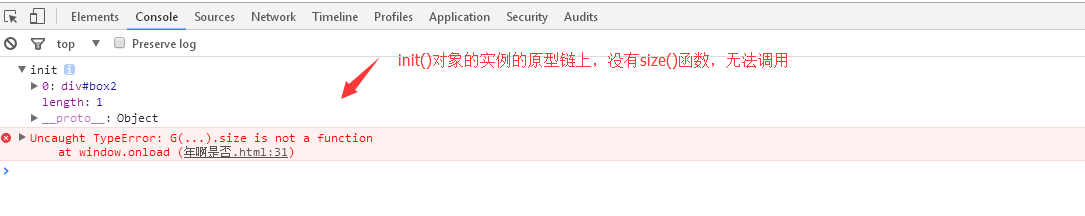 5. 当构造函数返回的不是G上的fn对象上的init()函数,而是G上的fn上的init对象的实例的时候,这时就不能调用size()函数了,因为在init()实例的原型链上没有size()函数;