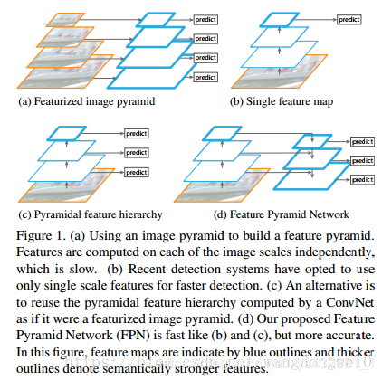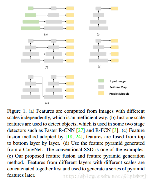 (d)是SSD的结构代表图,从网络不同层抽取不同scale的feature做预测,这种方式不会增加额外的计算量,但是各个scale之间没有联系;