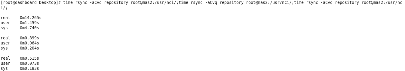 注意,在dashboard连续执行了三次time scp -qr repository root@mas2:/usr/nci/,其中第一次是在mas2不存在文件夹repository情况下执行的,第二次和第三次是在在mas2存在文件夹repository情况下执行的。