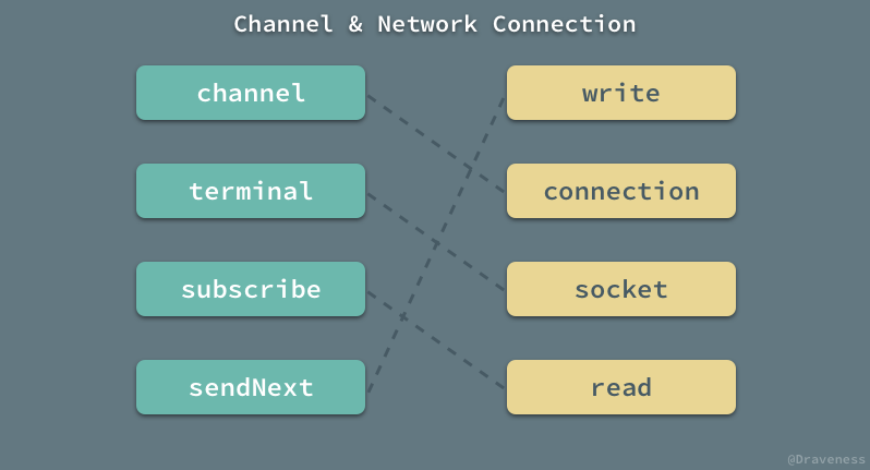 RACChannel 和 RACChannelTerminal 的关系非常密切,前者可以理解为一个网络连接,后者可以理解为 socket ,表示网络连接的一端,下图描述了 RACChannel 与网络连接中概念的一一对应关系。