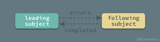 通过 -ignoreValues 和 -subscribe: 方法, leadingSubject 和 followingSubject 两个热信号中产生的错误会互相发送,这是为了防止连接的两端一边发生了错误,另一边还继续工作的情况的出现。