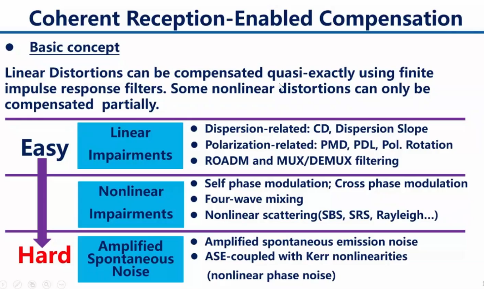 ASE噪声不能被补偿,ASE和Kerr非线性效应会发生相互作用产生非线性相位噪声,可以被部分补偿,Kerr非线性是确定性的,因此可以被补偿一部分,但是信号是随机的,类高斯的噪声