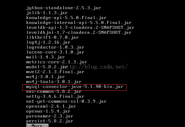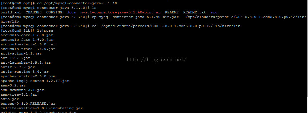 cd /opt/mysql-connector-java-5.1.40cp mysql-connector-java-5.1.40-bin.jar /opt/cloudera/parcels/CDH-5.8.0-1.cdh5.8.0.p0.42/lib/hive/lib把mysql-connector-java-5.1.40-bin.jar放到/opt/cloudera/parcels/CDH-5.8.0-1.cdh5.8.0.p0.42/lib/hive/lib中。 cd /opt/cloudera/parcels/CDH-5.8.0-1.cdh5.8.0.p0.42/lib/hive/libls|more确认已经放进去了。