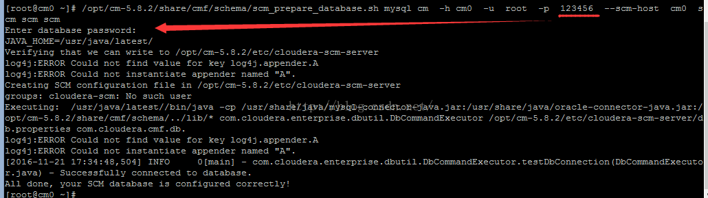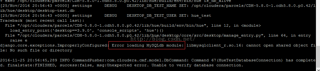 这是hive的lib包中缺少mysql的驱动导致的。我们之前已经把mysql驱动包mysql-connector-java-*-bin.jar放到主节点cm0的/opt中,现在复制一份到/opt/cloudera/parcels/CDH-5.8.0-1.cdh5.8.0.p0.42/lib/hive/lib(这里CDH-5.8.0-1.cdh5.8.0.p0.42要跟自己的版本对应)