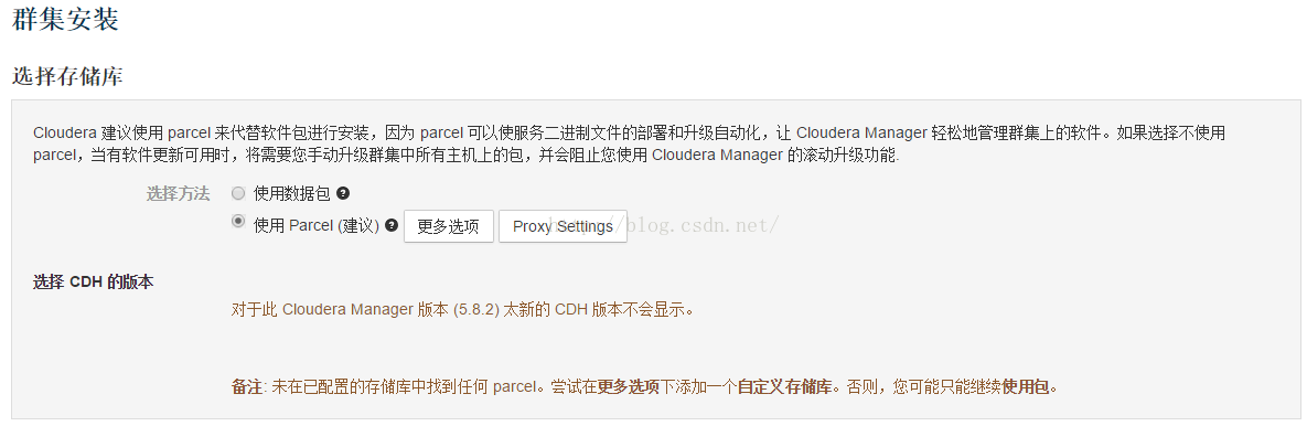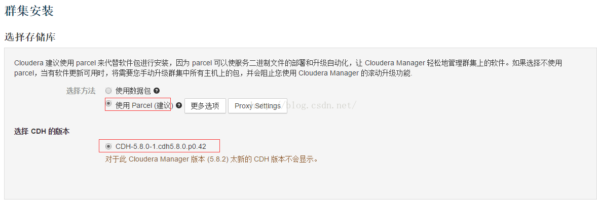 而且需要注意的是CDH的版本需要等于或者小于CM的版本,因为我们的CM是5.8.2版本,所以要选择小于或者等于5.8.2的版本。