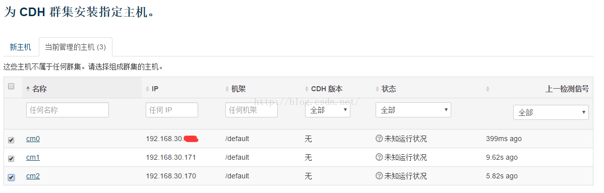 以上就是任性冬日最近收集整理的关于hadoop基础----hadoop实战(七)-----hadoop管理工具---使用Cloudera Manager安装Hadoop---Cloudera Manager和CDH5.8离线安装简介环境选择安装方式下载相关包系统安装安装vmware tools网络配置hadoop基础-------虚拟机(五)-----虚拟机linux系统网络配置的三种模式关闭防火墙修改主机名和hosts文件设置ssh无密码登陆(所有节点)配置NTP服务 所有节点安装jdk主节点安装mysql检查环境主节点安装C的全部内容,更多相关hadoop基础----hadoop实战(七)-----hadoop管理工具---使用Cloudera内容请搜索靠谱客的其他文章。