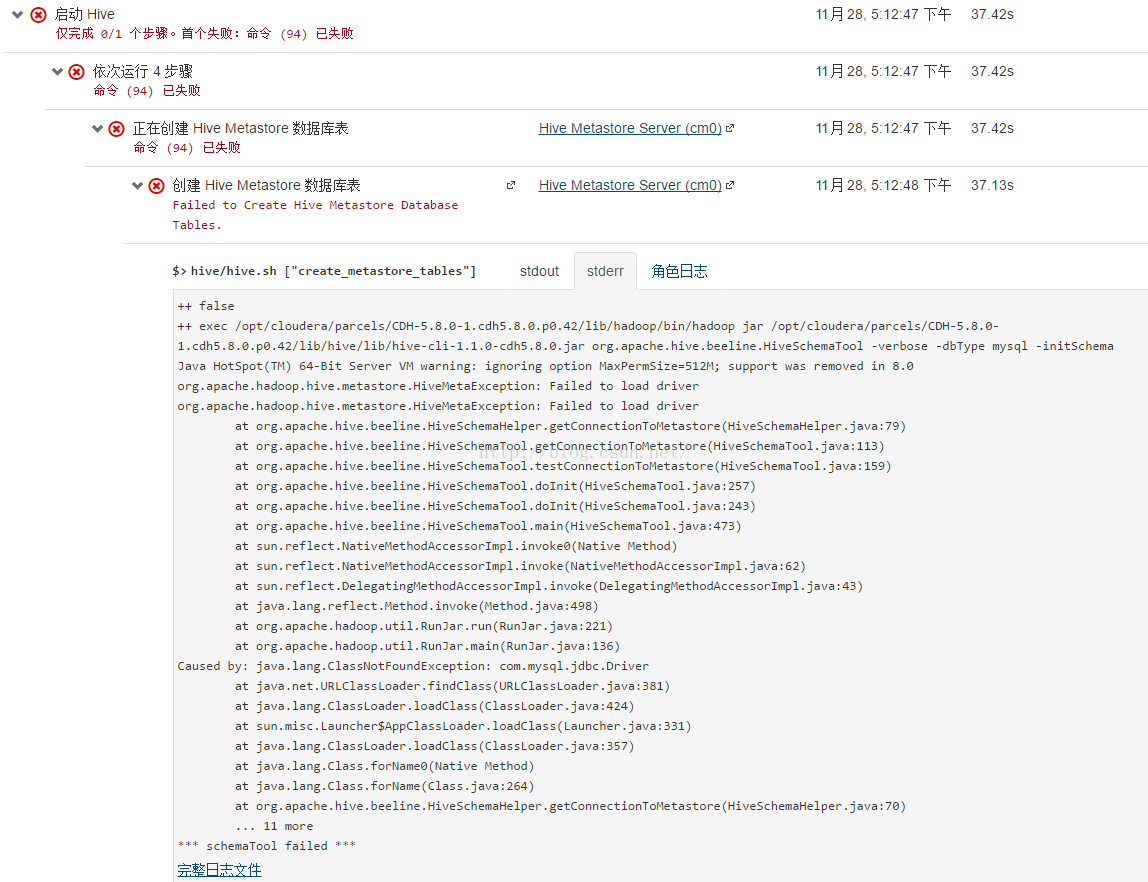 ++ false++ exec /opt/cloudera/parcels/CDH-5.8.0-1.cdh5.8.0.p0.42/lib/hadoop/bin/hadoop jar /opt/cloudera/parcels/CDH-5.8.0-1.cdh5.8.0.p0.42/lib/hive/lib/hive-cli-1.1.0-cdh5.8.0.jar org.apache.hive.beeline.HiveSchemaTool -verbose -dbType mysql -initSchemaJava HotSpot(TM) 64-Bit Server VM warning: ignoring option MaxPermSize=512M; support was removed in 8.0org.apache.hadoop.hive.metastore.HiveMetaException: Failed to load driverorg.apache.hadoop.hive.metastore.HiveMetaException: Failed to load driverat org.apache.hive.beeline.HiveSchemaHelper.getConnectionToMetastore(HiveSchemaHelper.java:79)at org.apache.hive.beeline.HiveSchemaTool.getConnectionToMetastore(HiveSchemaTool.java:113)at org.apache.hive.beeline.HiveSchemaTool.testConnectionToMetastore(HiveSchemaTool.java:159)at org.apache.hive.beeline.HiveSchemaTool.doInit(HiveSchemaTool.java:257)at org.apache.hive.beeline.HiveSchemaTool.doInit(HiveSchemaTool.java:243)at org.apache.hive.beeline.HiveSchemaTool.main(HiveSchemaTool.java:473)at sun.reflect.NativeMethodAccessorImpl.invoke0(Native Method)at sun.reflect.NativeMethodAccessorImpl.invoke(NativeMethodAccessorImpl.java:62)at sun.reflect.DelegatingMethodAccessorImpl.invoke(DelegatingMethodAccessorImpl.java:43)at java.lang.reflect.Method.invoke(Method.java:498)at org.apache.hadoop.util.RunJar.run(RunJar.java:221)at org.apache.hadoop.util.RunJar.main(RunJar.java:136)Caused by: java.lang.ClassNotFoundException: com.mysql.jdbc.Driverat java.NET.URLClassLoader.findClass(URLClassLoader.java:381)at java.lang.ClassLoader.loadClass(ClassLoader.java:424)at sun.misc.Launcher$AppClassLoader.loadClass(Launcher.java:331)at java.lang.ClassLoader.loadClass(ClassLoader.java:357)at java.lang.Class.forName0(Native Method)at java.lang.Class.forName(Class.java:264)at org.apache.hive.beeline.HiveSchemaHelper.getConnectionToMetastore(HiveSchemaHelper.java:70)... 11 more*** schemaTool failed ***