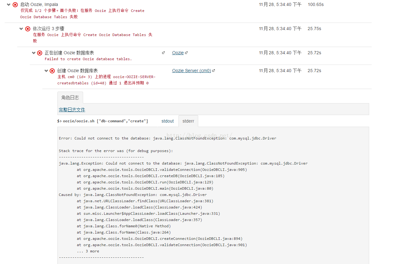 Oozie的lib包中缺少mysql的驱动导致的。我们之前已经把mysql驱动包mysql-connector-java-*-bin.jar放到主节点cm0的/opt中,现在复制一份到/opt/cloudera/parcels/CDH-5.8.0-1.cdh5.8.0.p0.42/lib/Oozie/lib(这里CDH-5.8.0-1.cdh5.8.0.p0.42要跟自己的版本对应)