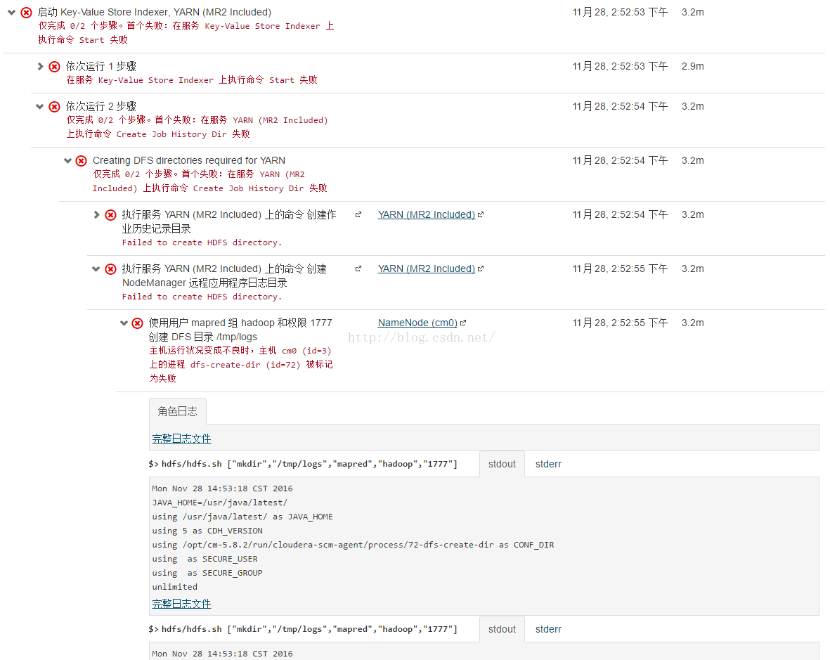 可能遇到的问题--启动 Key-Value Store Indexer, YARN (MR2 Included)---Create Job History Dir 失败