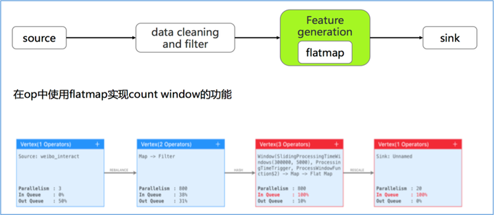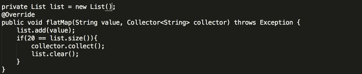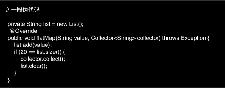 微博机器学习平台使用 Flink 实时处理用户行为日志和生成标签,并且在生成标签后写入存储系统。为了降低存储系统的 IO 负载,有批量写入的需求,同时对数据延迟也需要进行一定的控制,因此需要一种有效的消息聚合处理方案。 在本篇文章中我们将详细介绍 Flink 中对消息进行聚合处理的方案,描述不同方案中可能遇到的问题和解决方法,并进行对比。 基于 flatMap 的解决方案 这是我们能够想到最直观的解决方案,即在自定义的 flatMap 方法中对消息进行聚合,伪代码如下: