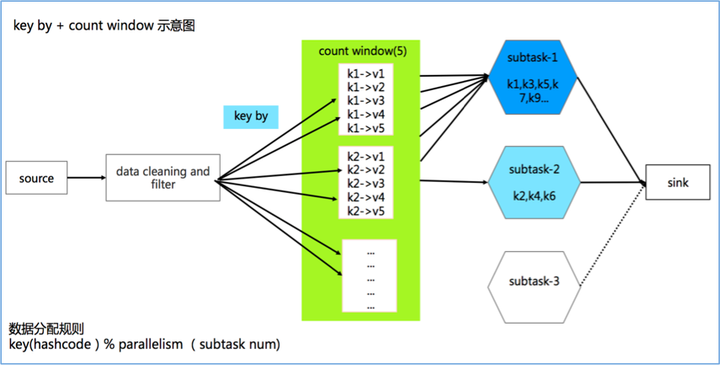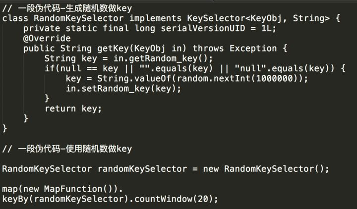 与此同时,由于使用 operator state,因此所有数据都保存在 JVM 堆上,当数据量较大时有 GC/OOM 风险。 使用 Count Window 的解决方案 对于大规模 state 数据,Flink 推荐使用 RocksDB backend,并且只支持在 KeyedStream 上使用。与此同时,KeyedStream 支持通过 Count Window 来实现消息聚合,因此 Count Window 成为第二个可选方案。 由于需要使用 KeyedStream,我们面临的第一个问题就是如何生成 key。一个比较自然的想法是直接使用随机数,伪代码示例如下: