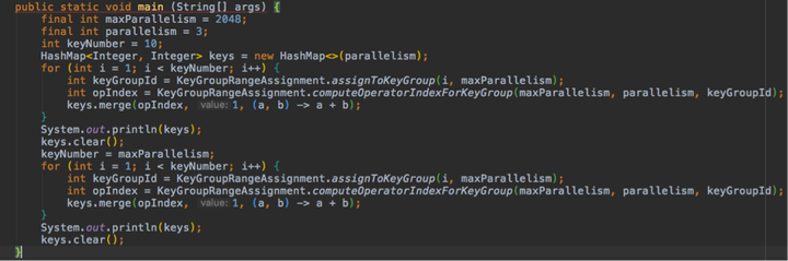 输出结果如下: {0=4, 1=4, 2=1} {0=651, 1=686, 2=710} 可以看到,当只有 10 个 key 时,并发间分布很不均匀;但当 key 的数量增加到 2048 时,就相对均匀了。 在了解了 key 的分发策略之后,我们可以相应的调整 key 的生成规则,来达到指定并发度和 key set 大小前提下的数据均匀,如下述代码所示: