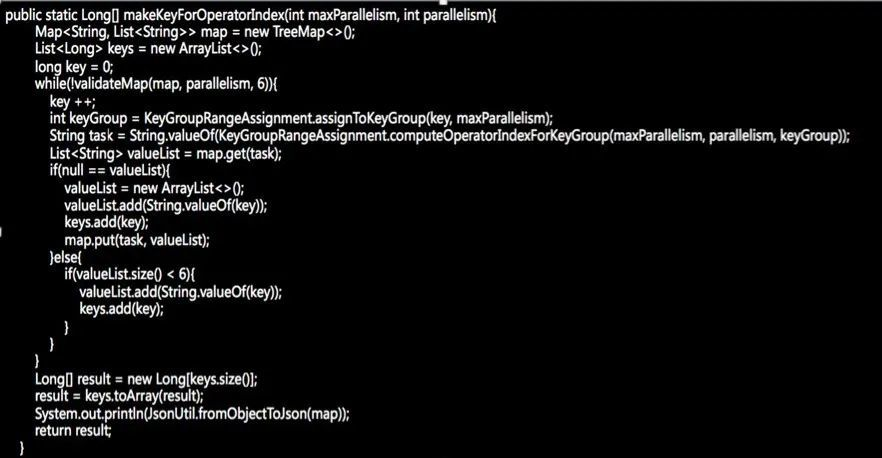 我们利用 maxParallelism 和 parallelism 生成 key,并将其存储到一个大小为 parallelism 的 map 里,以 taskid 作为 map key ,每个 task 对应的 key list 作为 value,来保证每个 taskid 对应的 list 都存储了相同数量的 key。 最后,再将 map 打平,存储到一个数组里。在使用的时候,我们可以从该数组里随机取数来作为key,就能达到平均分配的目的了。