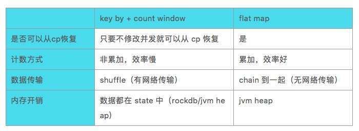 可以看到数据倾斜的问题得以解决,每个任务的负载都比较均匀。但需要注意的是由于引入了 key by,因此会有数据 shuffle,对比 flatmap 方案会有额外的网络开销。另外由于生成 key 的规则和实际并发度有关,因此该方案不支持改并发恢复,或者说如果修改并发,那么在 restore 的时候会发生数据错乱的问题,这一点需要尤为注意。 方案对比和总结 最后我们将两种解决方案的优缺点对比总结如下: