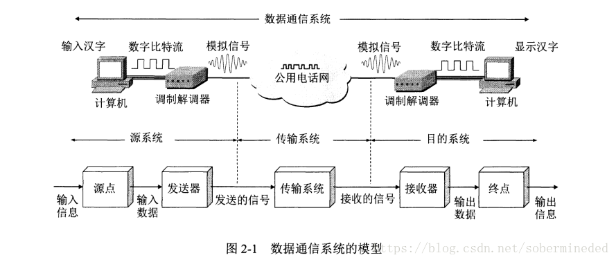 一个数据通信系统包括三大部分:源系统(或发送端、发送方)、传输系统(或传输网络)和目的系统(或接收端、接收方)。