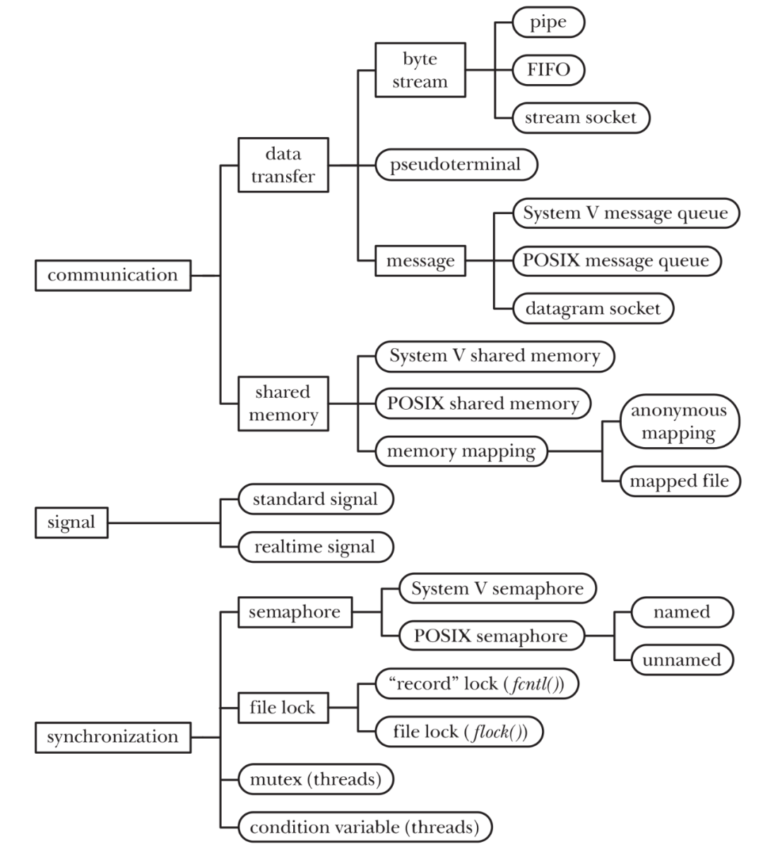 信号类 (signal):尽管信号的主要作用并不在此,但在特定场景下仍然可以将它作为一种同步技术。更罕见的是信号还可以作为一种通信技术:信号编号本身是一种形式的信息,并且可以在实时信号上绑定数据。