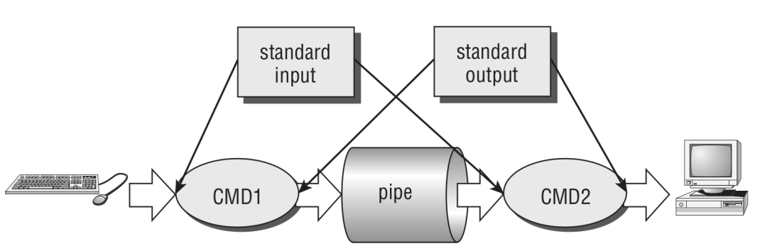 每当在管道中键入一个命令序列,让 shell 执行时,shell 都会为每一条命令单独创建一个进程,然后用管道将前一条命令进程的标准输出与后一条命令的标准输入相连接。shell 负责安排两个命令的标准输入和标准输出: