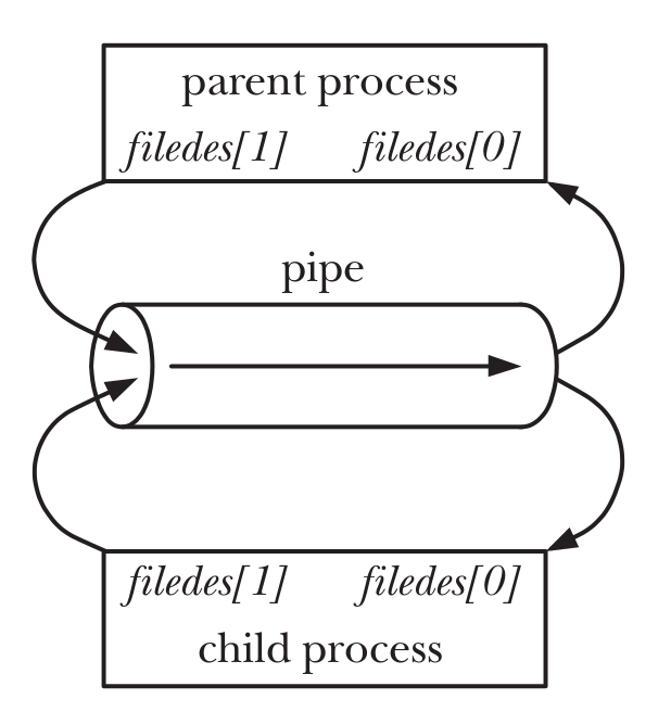 单个进程中的管道几乎没有任何用处。一般来讲都是使用管道让两个进程进行通信。为了让两个进程通过管道进行连接,在调用完 pipe() 之后可以调用 fork(),子进程会继承父进程的文件描述符的副本: