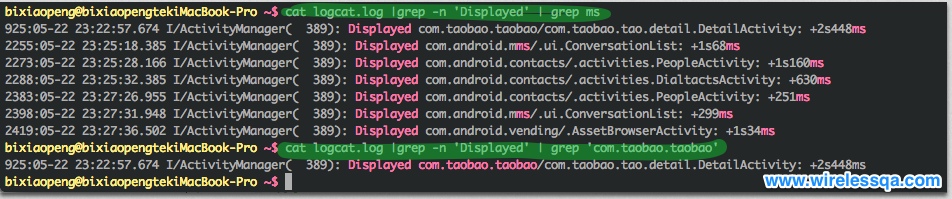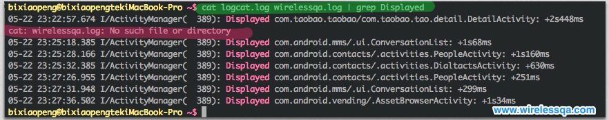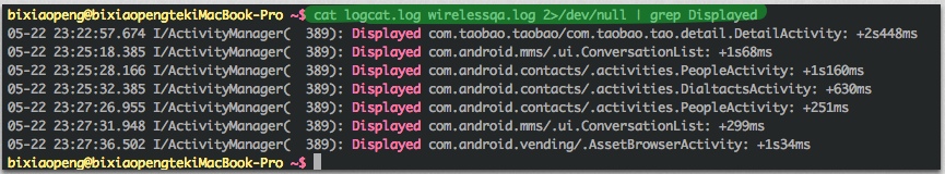 #2.读出logcat.log文件的内容,通过管道转发给grep作为输入内容,过滤包含‘Displayed’的行,将输出内容再作为输入能过管道转发给下一个grep