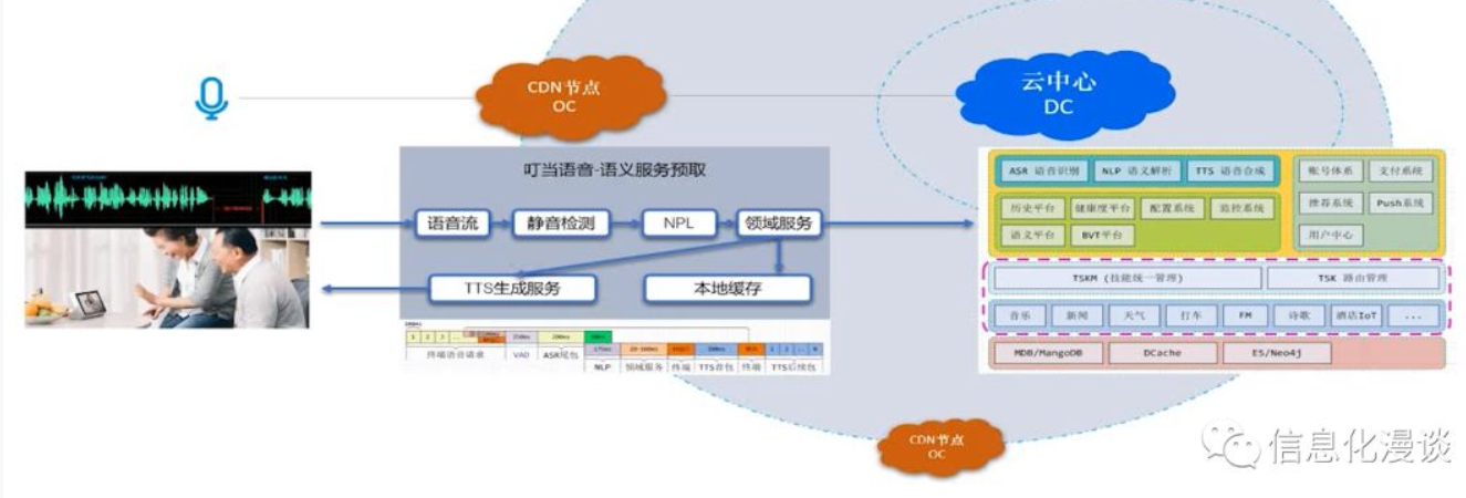 通过边缘计算,将语音输入信息就近处理,完成NLP(语音转文字),领域服务(通过本地缓存将用户所需要的信息即时返回用户)。基于边缘计算,可以降低约0.5秒的时延。