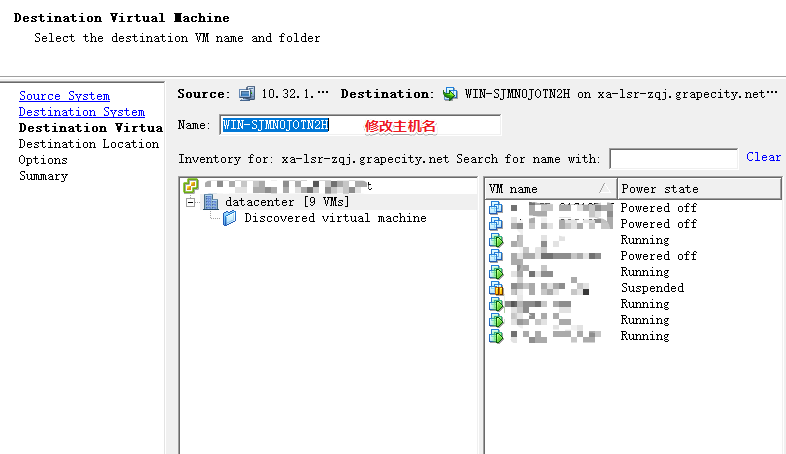 5、等上一步验证可以成功连接到vcenter后,会出现vcenter连接的虚机列表,可以在最上面修改转换后的虚机名称
