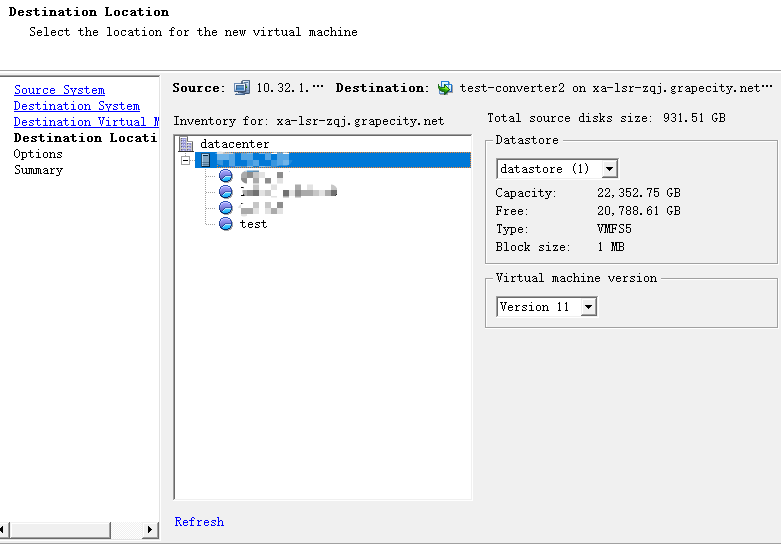 4、将物理机转换到哪里,可以选择esxi也可以选择vmware workstations,但是选择esxi后,需要填写vcenter的信息。