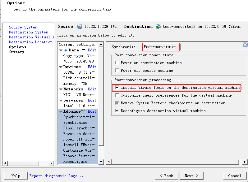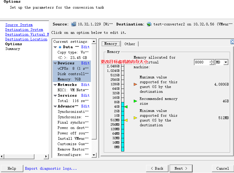 7、高级选项中可以自定义设置物理机转换后的虚机大小、网络、内存、物理机运行的服务等信息