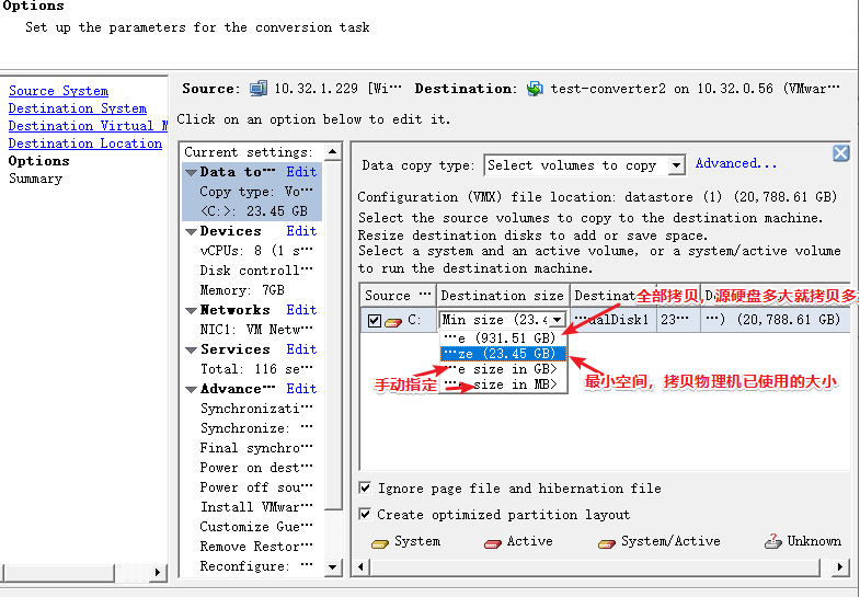 下图,可以选择 如何拷贝物理机的硬盘数据,若物理机的C盘是200G,实际用了50G